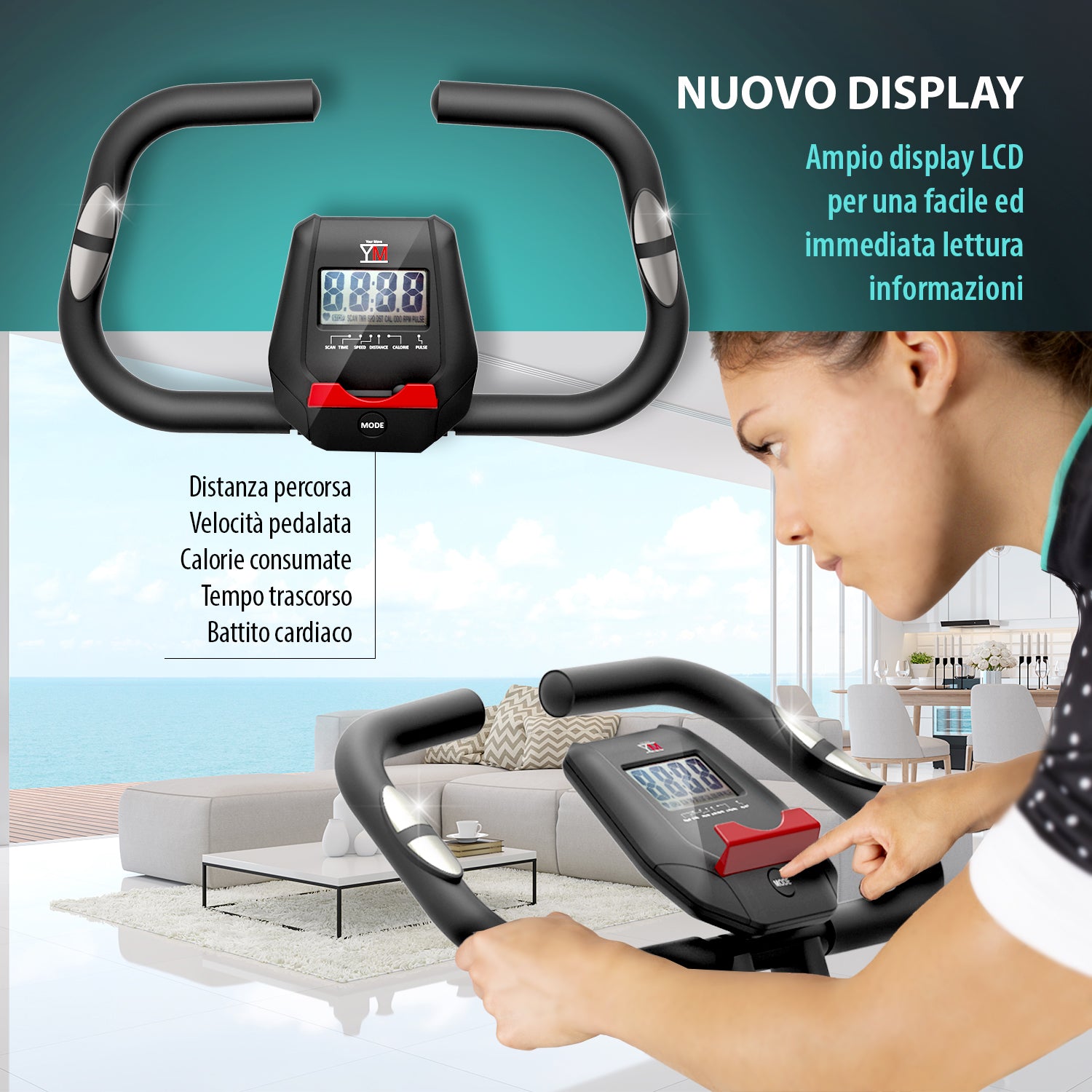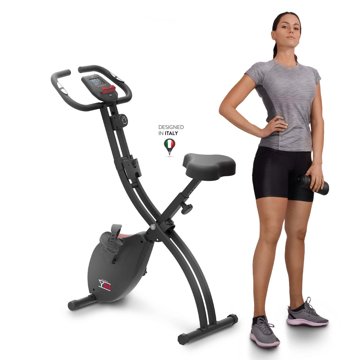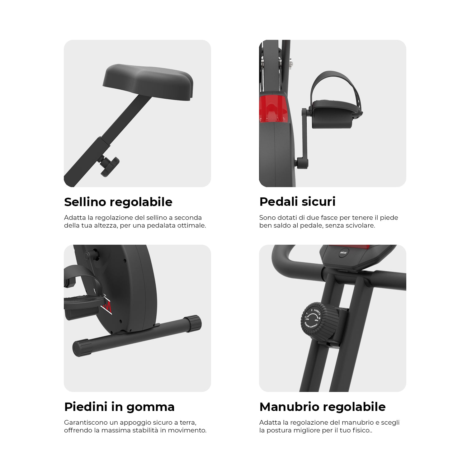 Design compatto, stabile e salvaspazio. Una volta terminati gli esercizi, è possibile piegare facilmente la bici senza sforzo e riporla in un armadio o dietro una porta. Blocco di sicurezza incluso. Pedali antiscivolo con strap regolabili. Piedini antiscivolo alla base della struttura. Adatta sia a donne che uomini.