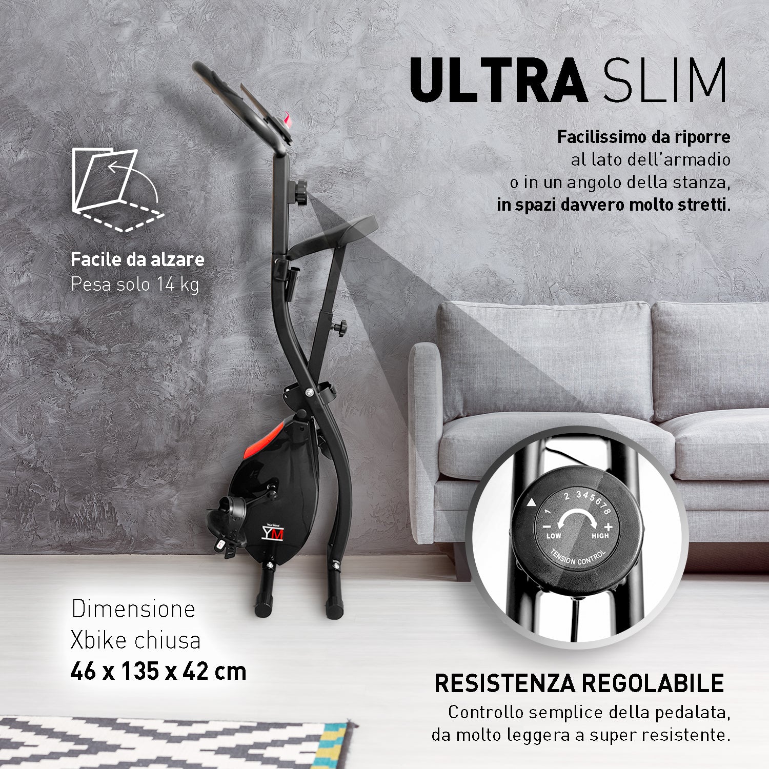 Telaio tubolare arrotondato in robusto acciaio con elegante finitura satinata di colore neri opaco, che permette alla X-BIKE di adattarsi a qualsiasi ambiente domestico. I sensori cardio presenti sul manubrio permettono di monitorare costantemente lo sforzo sul moderno display. Comodo porta accessori posizionato sotto il pomello di regolazione dello sforzo.