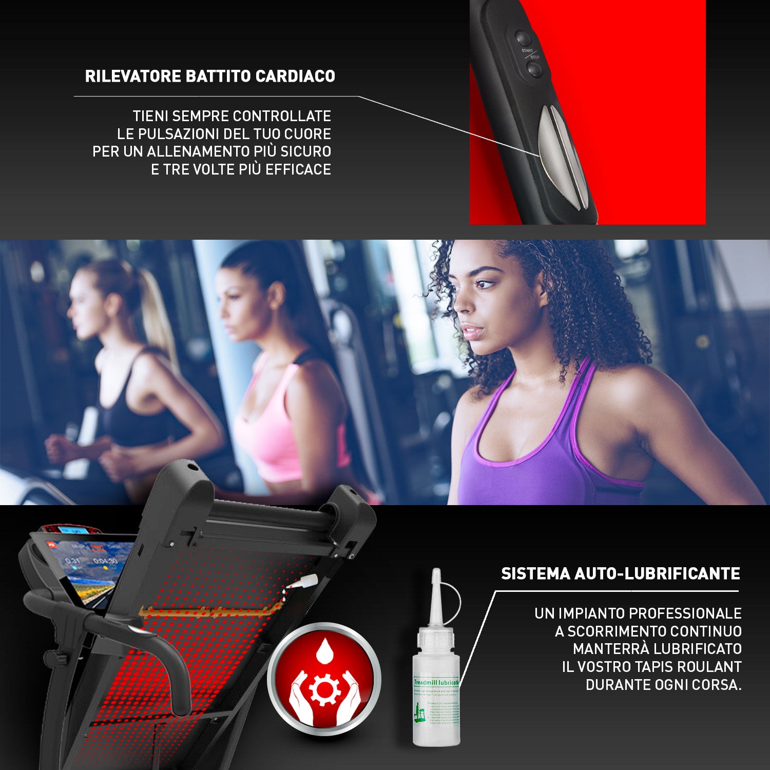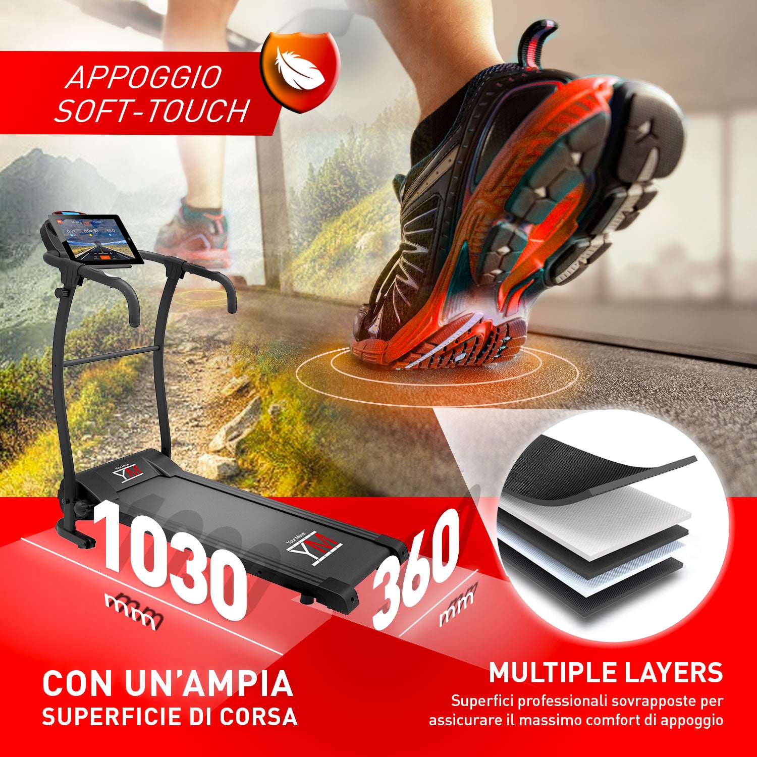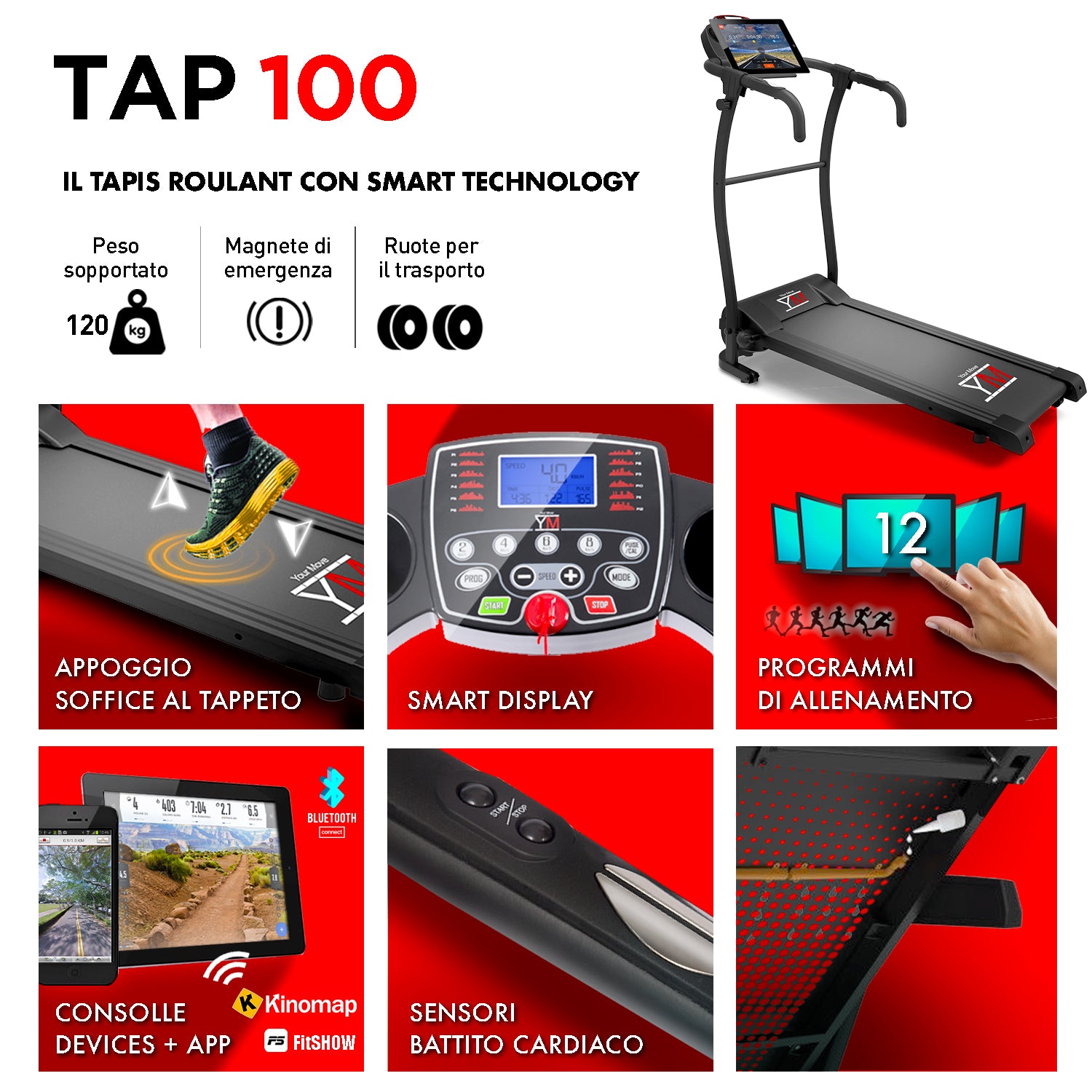 Tapis roulant elettrico Your Move YM TAP 100 ST, pieghevole e salvaspazio (con ‘Easy Lift’ per un minore ingombro da chiuso, facile da movimentare grazie alle ruote integrate), velocità fino a 10 Km/h e 12 programmi di allenamento. Sensori cardio, tasti regolazione velocità e start/stop sul manubrio. Pannello di corsa multistrato ammortizzato.