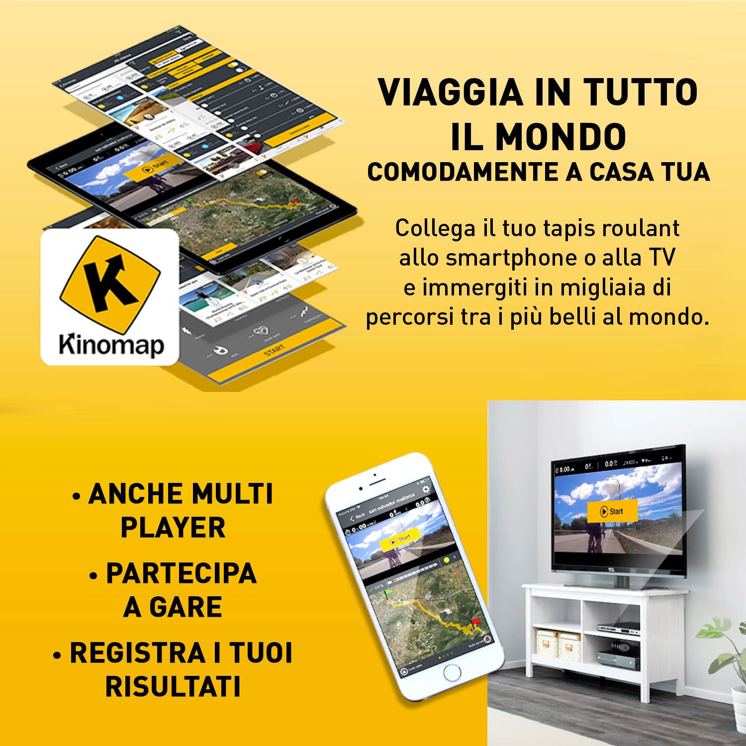 Bluetooth compatibile con APP dedicate (KINOMAP, ZWIFT, etc.) per allenamento online, interattivo, multiplayer, training, video coaching, streaming e molto altro. Con supporto tablet e smartphone e display multifunzione digitale LCD con tasti di scelta rapida. Chiave di sicurezza inclusa