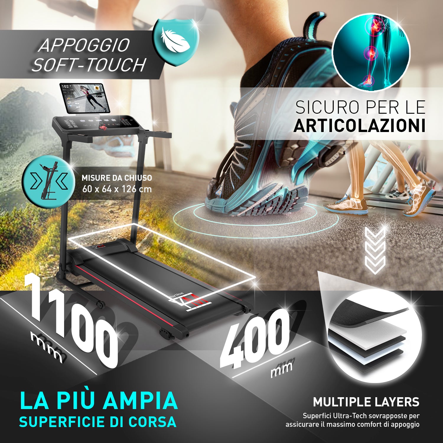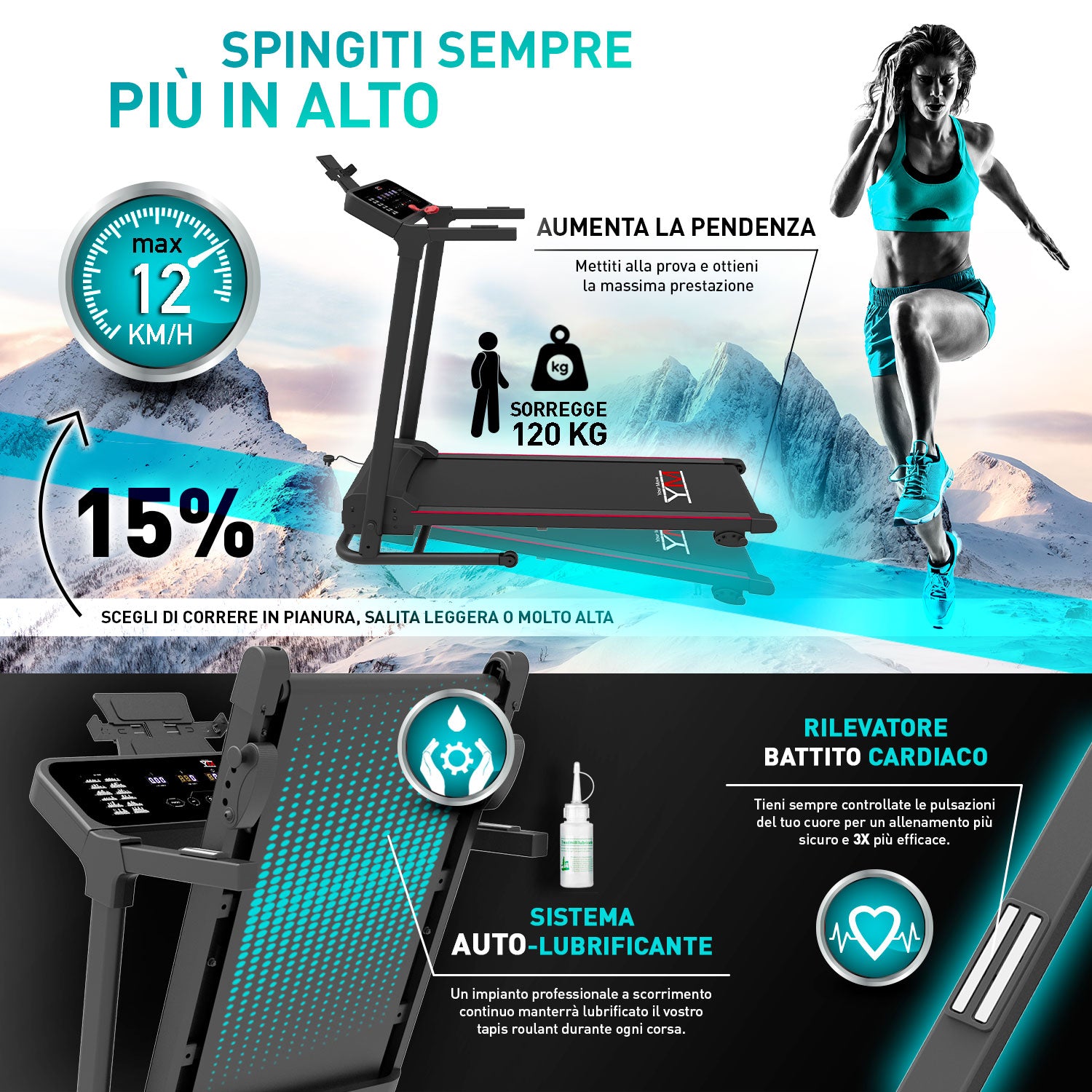 Tapis roulant con inclinazione regolabile manuale su 3 livelli, apertura servoassistita ‘soft drop’ con cilindro idraulico, 12 programmi preimpostati e velocità fino a 12 km/h. Dotato di tappeto di corsa Soft-Touch multistrato (massimo comfort di corsa), Motore lineare PowerDriveTM silenzioso e manubrio Soft-Grip con sensori pulse cardio