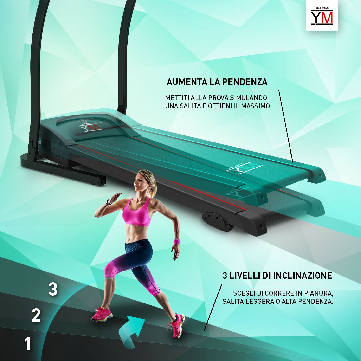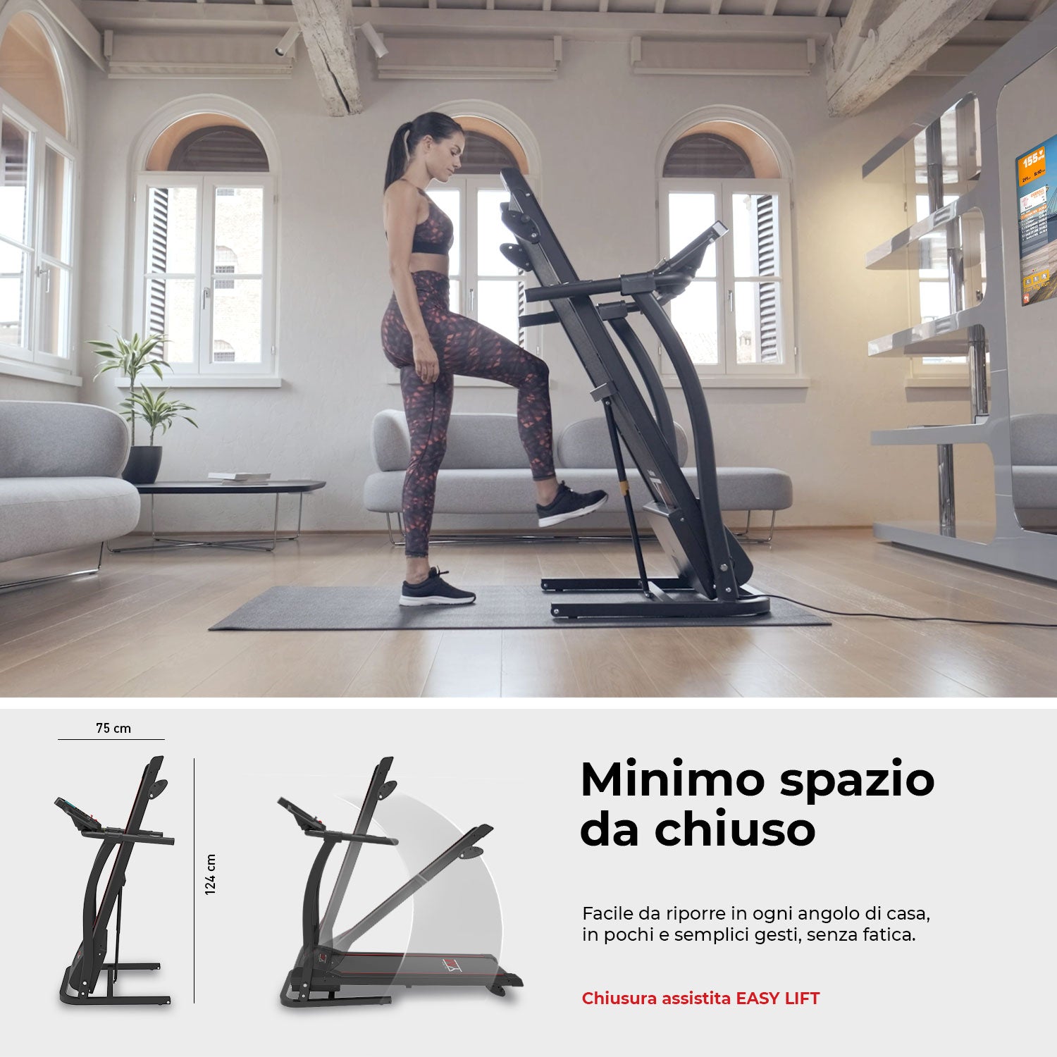 Tapis roulant con 3 livelli di inclinazione e velocità fino a 14 Km/h. Pieghevole e salvaspazio: con apertura servoassistita ‘Soft Drop’ idraulica e ‘Easy Lift’ per un minore ingombro da chiuso (facile da movimentare grazie alle ruote integrate). Con 16 programmi preimpostati. Sensori cardio, tasti regolazione velocità e start/stop sul manubrio e pannello di corsa multistrato ammortizzato.