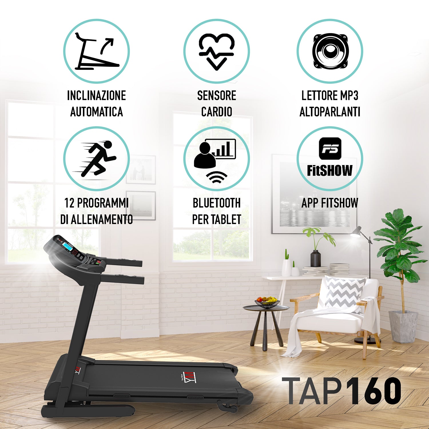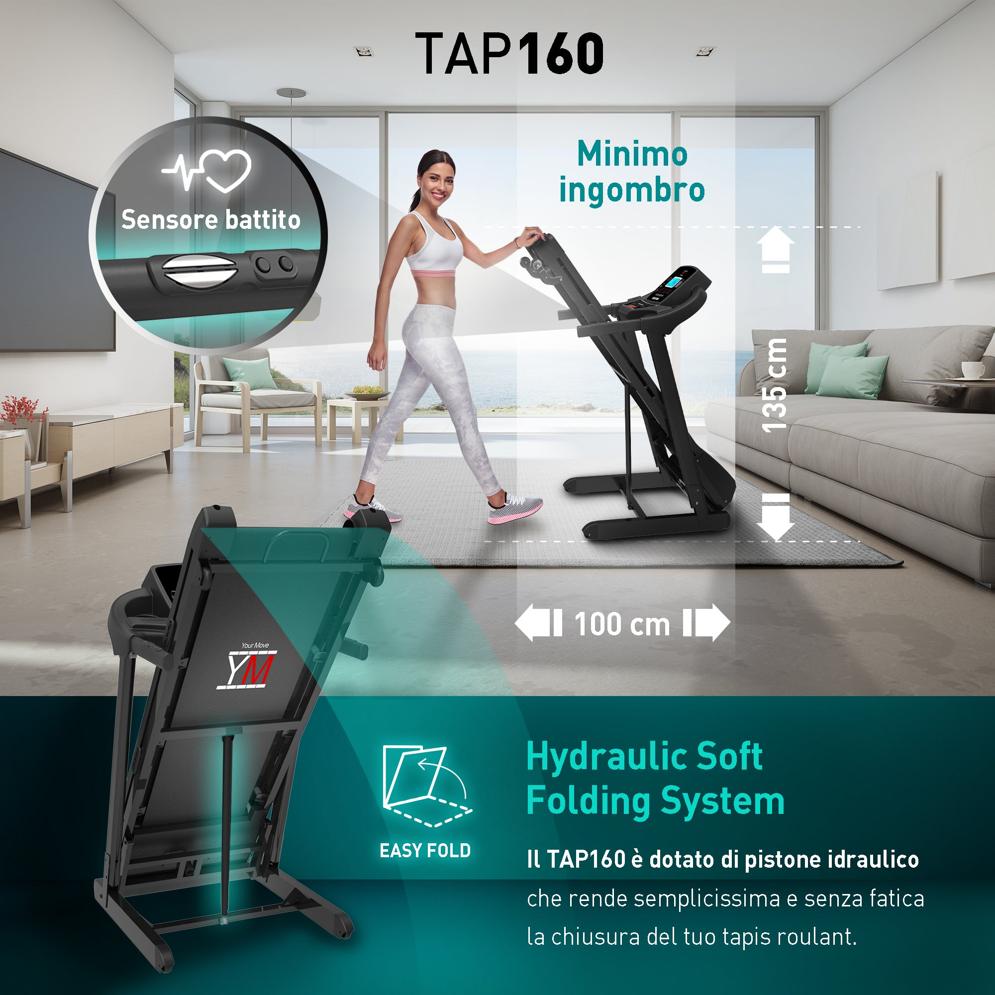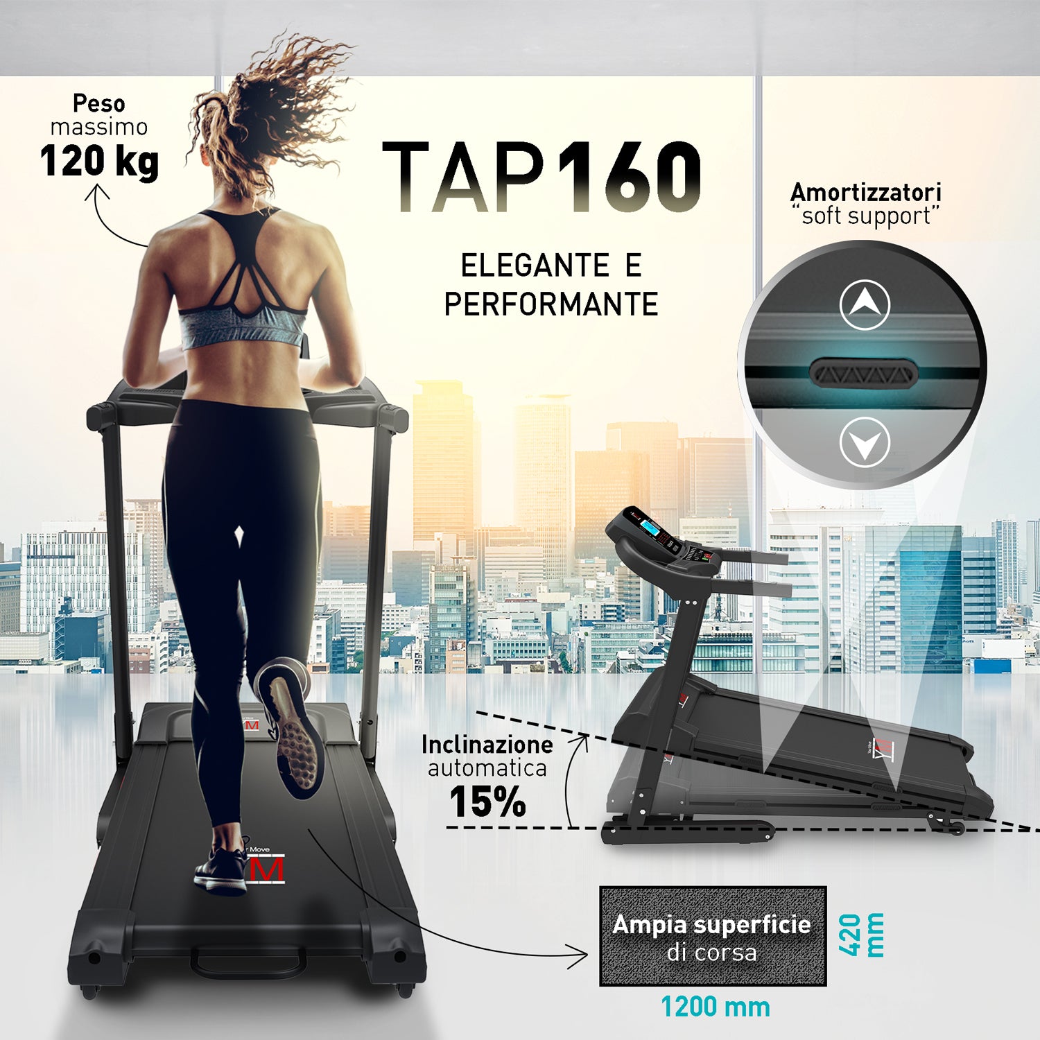 Tapis roulant a performance elevate con inclinazione automatica, ampia superficie di corsa e velocità fino a 16 Km/h. Inclinazione elettrica automatica fino al 15% e 12 programmi preimpostati. Struttura robusta e resistente, pieghevole e salvaspazio. Con sensori cardio, tasti regolazione velocità e start/stop sul manubrio. Pannello di corsa multistrato ammortizzato in 8 punti. Facile da movimentare grazie alle ruote integrate, pieghevole e salvaspazio con ‘Easy Lift’ per un minore ingombro da chiuso, apertura servoassistita ‘Soft Drop’ con cilindro idraulico.