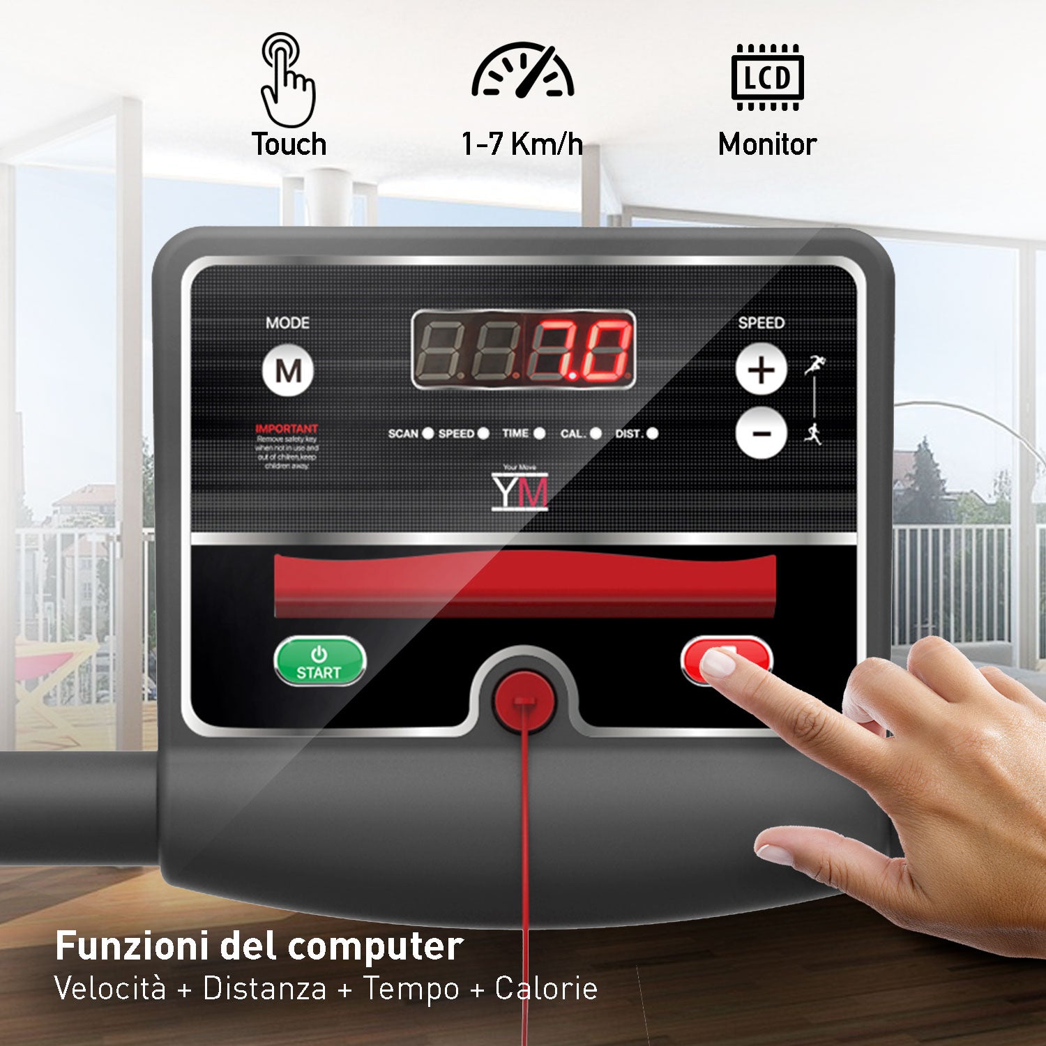 Tapis roulant super compatto, pieghevole e salvaspazio. Ideale per chi ha poco spazio in casa e necessità di un prodotto semplice e sicuro per effettuare camminate lenti e veloci comodamente a casa (Velocità massima di 7 km/h). Facile da usare e da spostare, grazie alle ruote integrate. Pannello di corsa multistrato. Nuovo display LCD multifunzione semplificato, con 3 programmi preimpostati e supporto per tablet e smartphone. Chiave di sicurezza inclusa