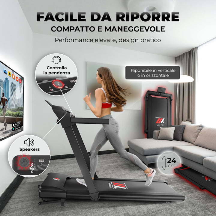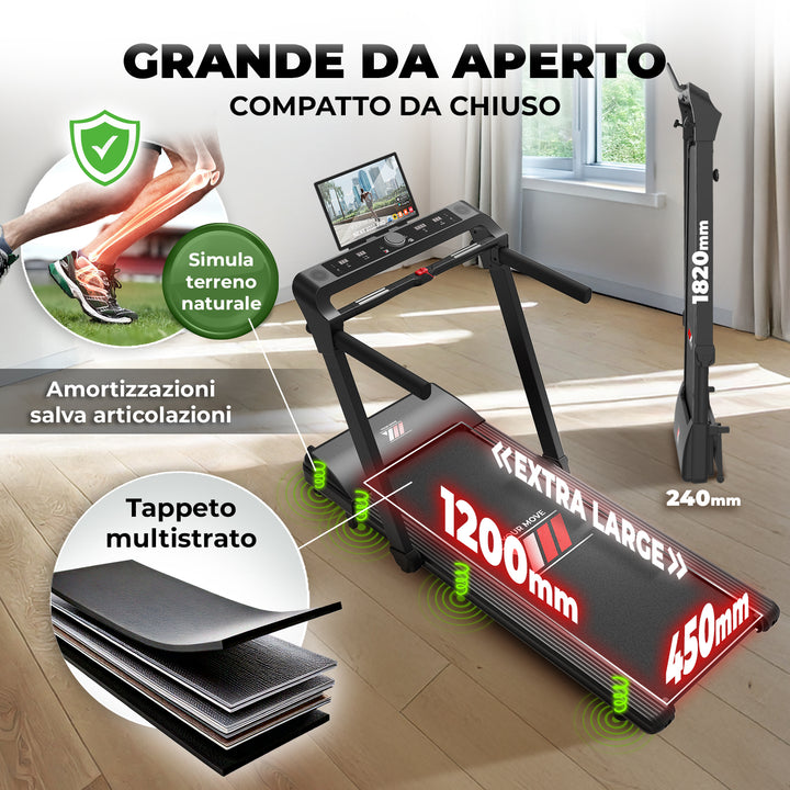 Tapis roulant professionale con inclinazione automatica (inclinazione massima 18%) Ampia superficie di corsa con pannello multistrato per allenarsi nel massimo del comfort e in totale sicurezza. Design moderno. Motore potente per correre fino a 18 km/h con sistema di risparmio energetico. Sensori cardio frontali. Maniglie addizionali di appoggio rivestite in morbida schiuma EVA antiscivolo, per una presa sempre sicura e piacevole. Telaio rinforzato, solido e robusto: stop alle oscillazioni. Chiusura/apertura in soli 15 secondi.