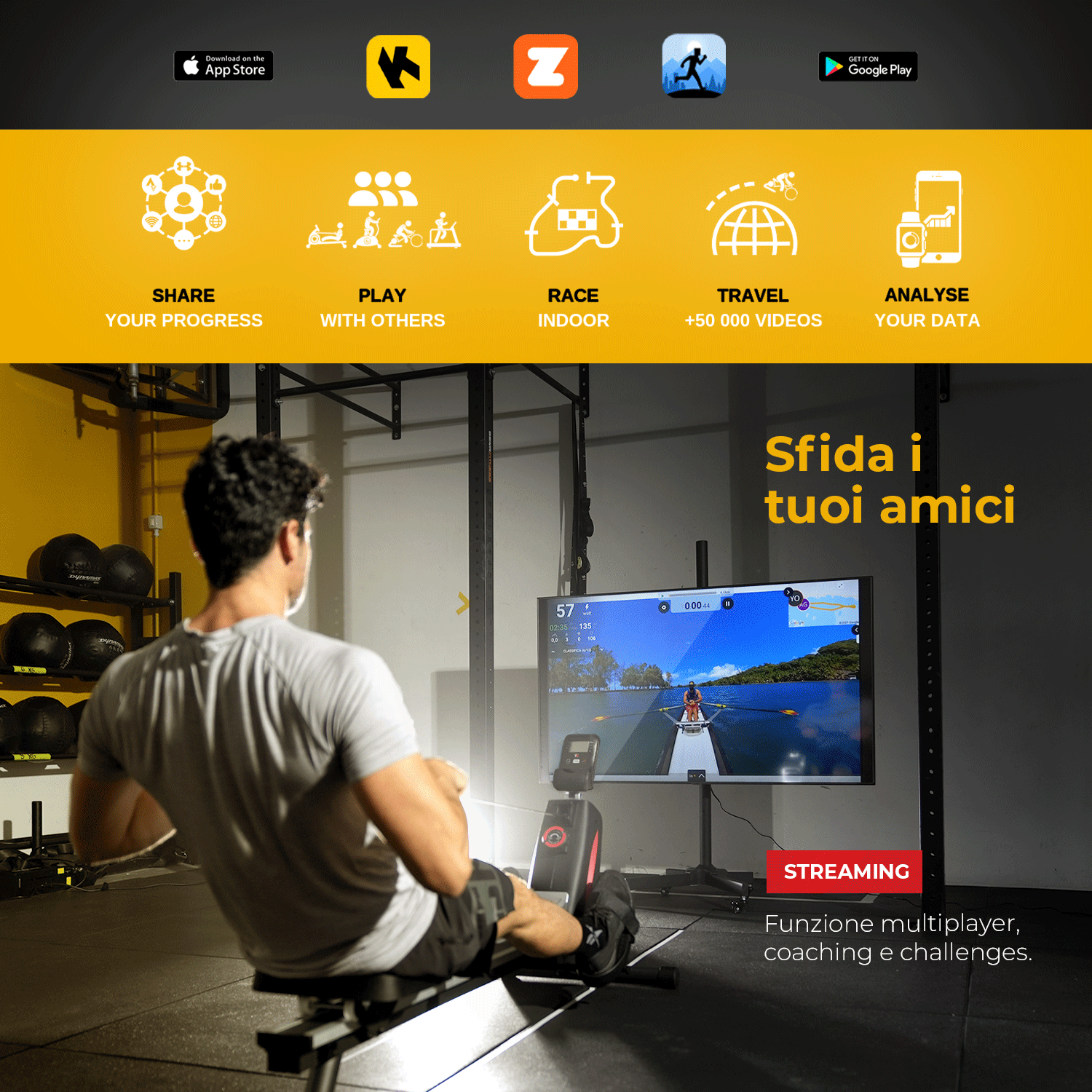 Compatibile con App KINOMAP per vivere un’esperienza unica e completa, comodamente da casa tua! E’ possibile proiettare video e percorsi reali di allenamento in acqua direttamente su TV, PC, TABLET o SMARTPHONE. Ad esempio, vogare in qualche paradiso tropicale o in un fiume di montagna. È anche possibile seguire sessioni di allenamento strutturate e fissare obiettivi, registrare i propri miglioramenti e tenerne traccia grazie alla cronologia, e molte altre funzioni!