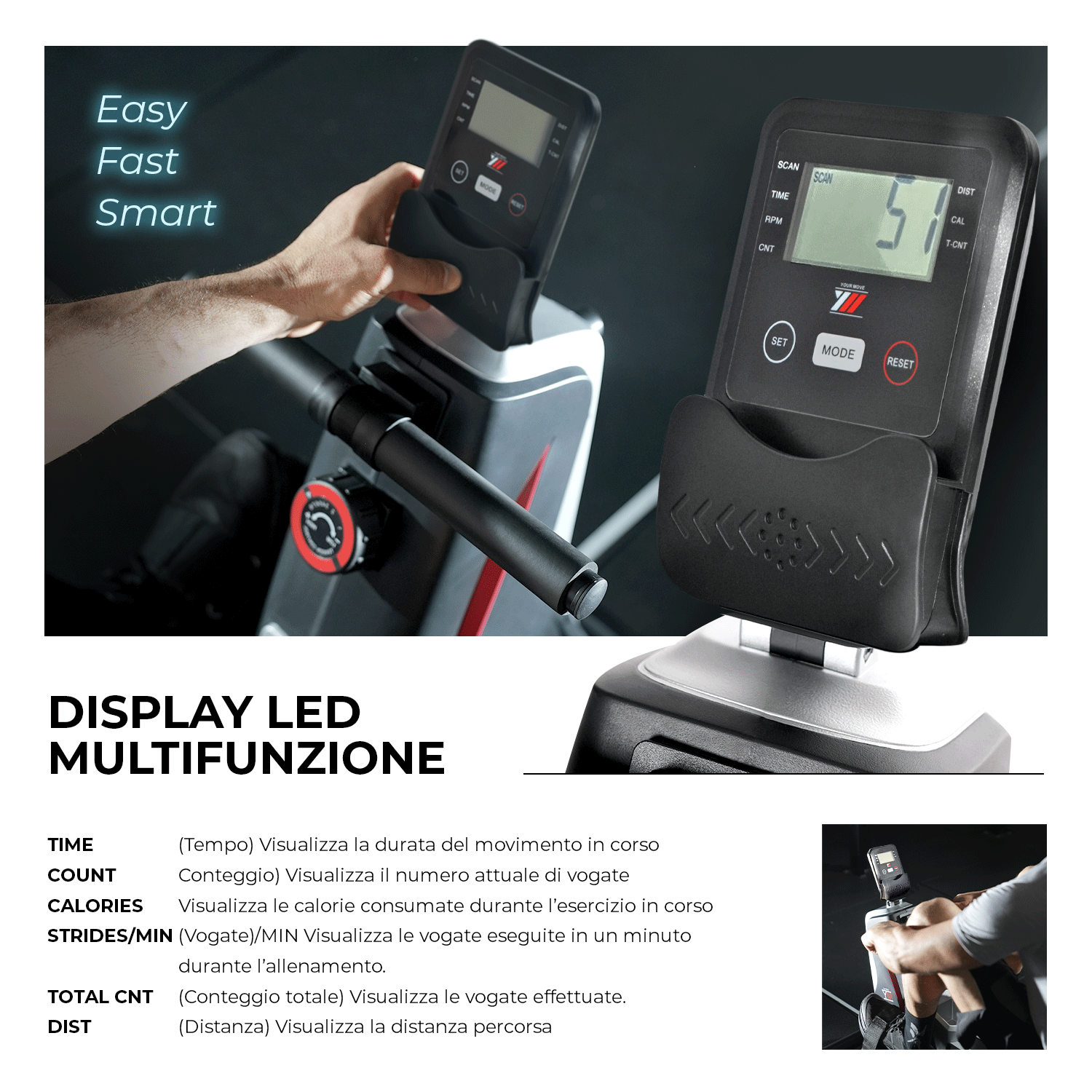 Seduta ergonomica ultra confortevole, perfetta per una corretta distribuzione del peso e della forza – Staffe per i piedi con supporto e strap regolabili, che permettono di mantenere costante la posizione corretta durante ogni vogata – Manubrio con impugnatura antiscivolo morbida, resistente e antisudore, per garantire una presa sicura e confortevole, senza affaticare dita e mani – Display con misurazione di Tempo, Distanza, Numero di Vogate per minuto e totali, Calorie, etc.