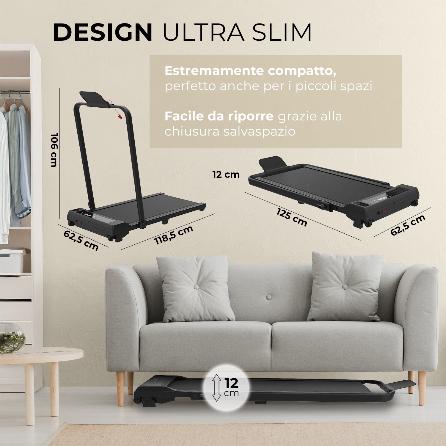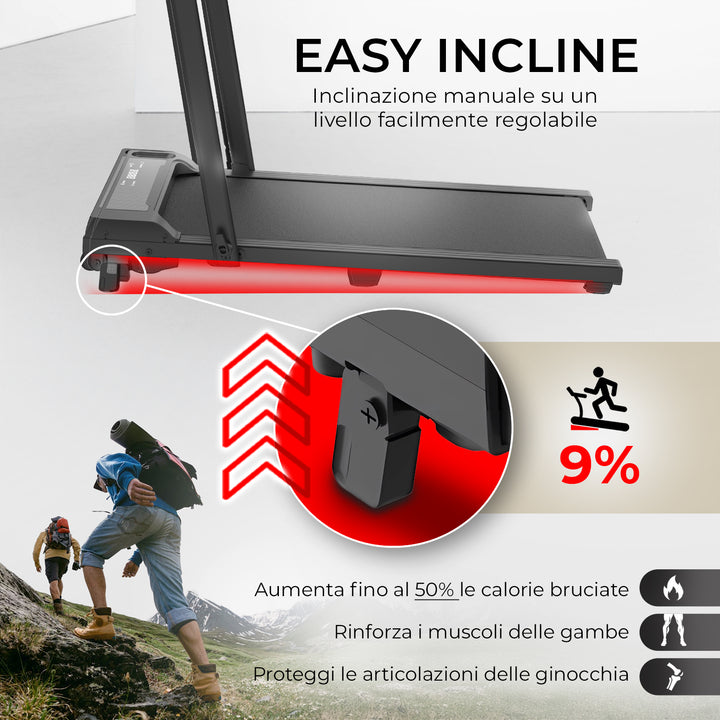 Il NEXT 500 PRO è un tapis roulant compatto, leggero e facile da spostare e riporre. Una volta chiuso, ha un'altezza di soli 12 cm, rendendolo così perfetto per essere nascosto facilmente negli spazi più stretti di casa, sotto al divano o al letto. Puoi facilmente estrarlo quando vuoi allenarti e riporlo agilmente alla fine di ogni allenamento. Struttura robusta con telaio rinforzato.