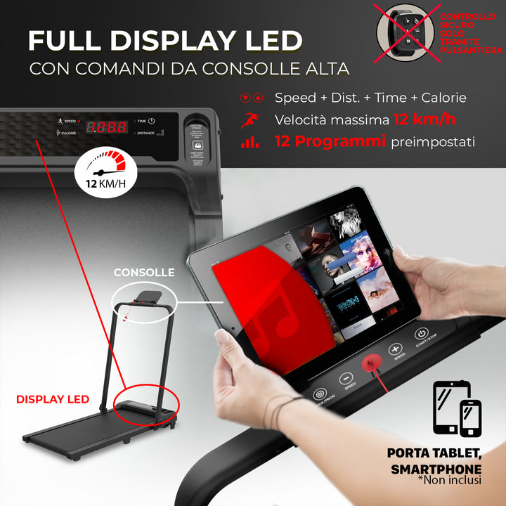 Tapis roulant dotato di display e una pulsantiera nella parte alta per regolare velocità, tempo e distanza desiderate. Oppure, per impostare uno dei 6 programmi di allenamento selezionati apposta per te. Usa il comodo appoggio per Tablet e Smartphone per guardare le tue serie tv preferite mentre ti alleni. Velocità 1-12 km/h. Potenza: 1.0 HP (Picco; 2,5 HP) – Peso max utente: 120 kg. Inclusa boccettina di olio lubrificante.